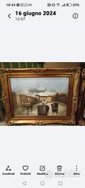 Coppia di quadri. 70 x 50.olio su tela di Luigi Rocca pittore con stile iperrealistico che crea un effetto quasi illusionistico. I due quadri rappresentano figure in passeggiata e scena urbana con carrozze trainate da cavalli e un tram in una giornata piovosa...cornice ricca dorata in stile barocco