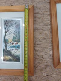 Vendo splendida coppia di quadri coordinati, perfetti per donare calore e profondità a qualsiasi ambiente della casa (soggiorno, camera o corridoio). Le opere raffigurano due scenari naturali contrastanti e ricchi di fascino. 1-Paesaggio Invernale: Una scena eterea con alberi spogli e cavalli vicino a uno specchio d'acqua, nei toni freddi dell'azzurro e del grigio. 2-Tramonto/Alba Dorata: Una veduta calda e vibrante con riflessi dorati sull'acqua e silhouette di montagne. Entrambe le stampe sono valorizzate da un doppio passepartout bianco con profilo argento e da una solida cornice in legno naturale chiaro, che le rende facili da abbinare a stili sia moderni che classici. Condizioni ottime, cornici integre e colori ben conservati.