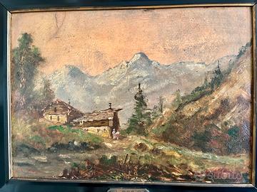 L’opera raffigura un suggestivo paesaggio alpino con baite immerse in una luce calda e soffusa. La composizione è equilibrata e profonda, con le montagne che si stagliano sullo sfondo in tonalità azzurrate e grigio-perla. La pennellata è sciolta e vibrante, con tocchi materici nelle zone di primo piano e velature più leggere nelle montagne, a creare un delicato effetto atmosferico. La presenza di piccole figure umane accentua il senso di quiete e armonia con la natura.