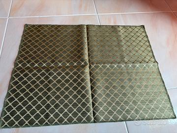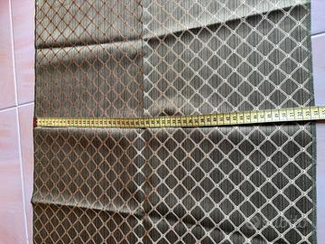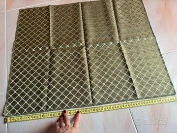 Vendo bellissima coppia di runner quadrati in stile classico, realizzati in pregiato tessuto operato tipo broccato. Dettagli del prodotto: • Colore: Elegante base verde salvia/olivastro con trama a rombi ed elementi decorativi in rilievo color oro/bronzo. Il tessuto ha una bellissima lucentezza cangiante a seconda della luce. • Motivo: Trama geometrica classica a losanghe con piccoli nodi decorativi agli incroci. • Dimensioni: Circa 64 cm x 54 cm (come visibile dalle foto con metro). • Finitura: Bordi rifiniti con orlo a macchina preciso e pulito. Stato e Utilizzo: I pezzi sono in condizioni eccellenti, pari al nuovo. Il tessuto è sostenuto e di ottima consistenza, ideale per proteggere e decorare mobili antichi, comodini o tavolini da salotto. Perfetti per chi ama lo stile classico, regale o per chi vuole aggiungere un tocco vintage di classe a un arredamento moderno.