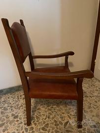 Elegante coppia di sedie vintage con struttura in legno e seduta/schienale rivestiti in similpelle color marrone. Design classico e braccioli curvi. Ideale per arredamenti in stile retrò, rustico o classico. Solida e comoda, perfetta per studio, soggiorno o come pezzo decorativo.