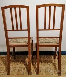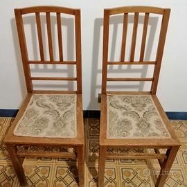 Coppia di sedie antiche in stile Liberty, in legno, con seduta rivestita in stoffa. Dimensioni: Altezza 90 cm; Altezza seduta 42 cm; Profondità 38 cm; Larghezza 38,5 cm.