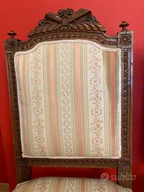 Splendida coppia di sedie antiche in stile Luigi XVI, in legno massello, con schienale alto intagliato e seduta imbottita.