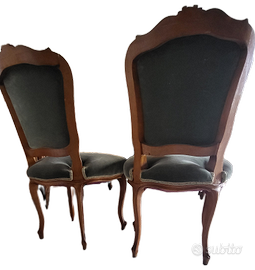 Elegante coppia di sedie degli anni ’50, realizzate a mano in legno intagliato e rivestite in velluto verde acido, impreziosite da bottoncini in ottone.
