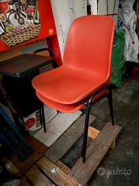 Struttura in metallo nera molto robusta, seduta e schienale in materiale plastico rigido colore arancione/rosso, comode, stabili, ben conservate. Le tavolette si sollevano facilmente e sono in buone condizioni.