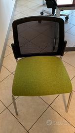 Vendo coppia di sedie moderne con struttura in metallo cromato, schienale in rete nera e seduta imbottita in tessuto verde.