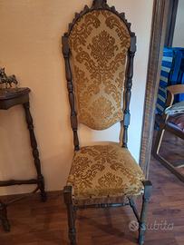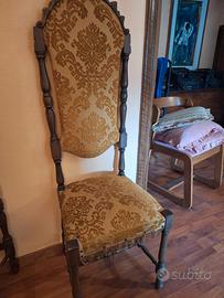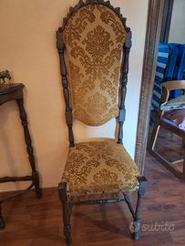 Coppia di sedie in legno stile classico, eleganti e di grande presenza. Sedie con schienale alto sagomato e struttura in legno lavorato, complete di seduta e schienale imbottiti con tessuto damascato decorativo. Linee raffinate e proporzioni slanciate, tipiche dei mobili tradizionali di una volta. Struttura solida e stabile, adatte sia per sala da pranzo che per arredare ambienti classici o dare un tocco di carattere a spazi più moderni. In buone condizioni generali, con normali segni del tempo. Tessuto originale ben conservato.