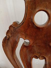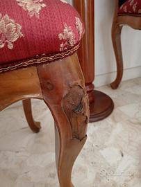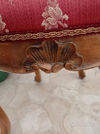 Schienale traforato, gambe cabriolet, seduta imbottita con tessuto damascato rosso e passamaneria dorata.