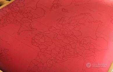 Schienale imbottito, rivestito in tessuto rosso lavorato; anche la seduta, a trapezio, è imbottita e rivestita in tessuto rosso lavorato, raffigurante la cartografia mondiale.