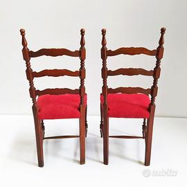 Coppia di sedie a trono per tavolo pranzo interamente in legno massiccio, e con schienale e seduta imbottita rivestita in tessuto rosso lavorato damascato a rilievo. Possibile collocazione anche come sedie da ingresso o arredo. Dimensioni 45x42x48, altezza schienale 106 cm