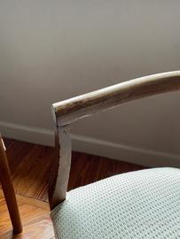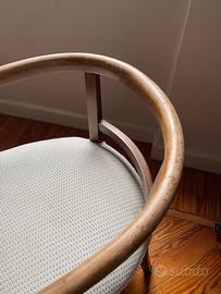 Coppia di sedie vintage stile Mid-Century Modern in legno curvato e tessuto chiaro. Elegante coppia di sedie vintage con struttura in legno massello curvato e seduta imbottita rivestita in tessuto chiaro. Design ispirato allo stile danese e Mid-Century Modern, perfette per arredare soggiorni, studi o ambienti in stile scandinavo e minimalista. Solide, comode e in ottime condizioni. Ritiro in loco!!