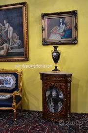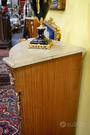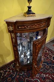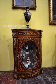 Coppia di servanti -angoliere in stile Napoleone III in legno massello , lastronate in noce e radica , arricchita da intarsi in legni da frutto a motivi floreali e fogliacei.