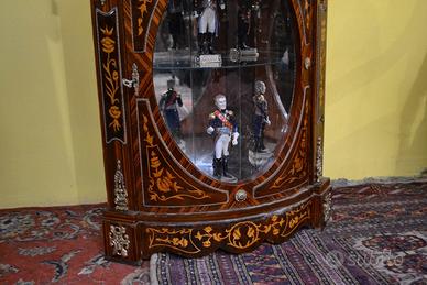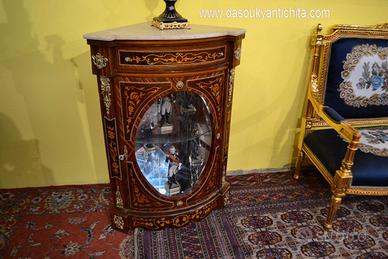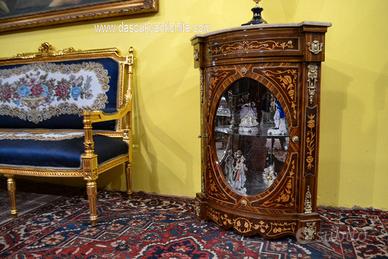 Provvista di un cassetto e uno sportello a vetro ovale , interno rifinito con specchi e ripiani in vetro per dare risalto agli oggetti in mostra, rifinite da ricche applicazioni in bronzo cesellato e dorato che permette di esporre oggetti all’interno.