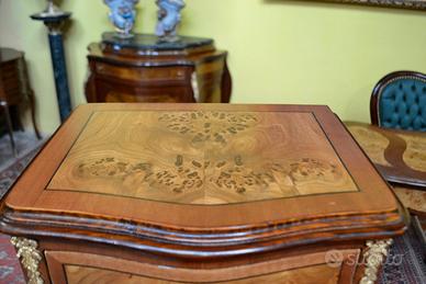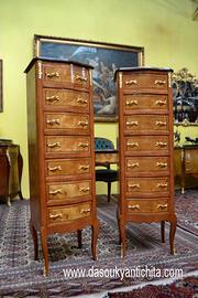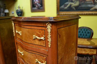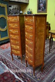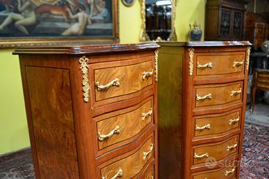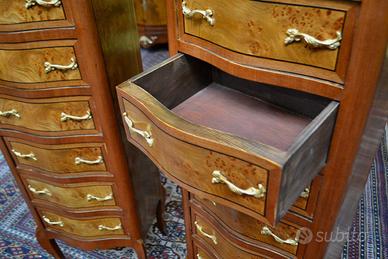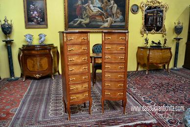 Coppia di settimini-cassettiere in stile Luigi XV in noce, caratterizzate da un design elegante, frontali leggermente bombati in legno massello e in noce e radica, rifiniti da maniglie e applicazioni in bronzo dorato Dalle dimensioni contenute, sono ideali per valorizzare angoli o pilastri, offrendo al contempo una capacità contenitiva straordinaria senza occupare eccessivo spazio a terra. Dimensioni : Larghezza 43 cm. Profondità 32 cm. Altezza 137 cm. ( dimensione interna dei cassetti 30x24x10 ) Chi fosse interessato a una visita virtuale della nostra galleria può accedere ai motori di ricerca, inserendo il nominativo " Dasouky antichita' " Per informazioni contattateci ai seguenti numeri Cell. - Cell. EURO 650,00 SPEDIZIONI IN TUTTA EUROPA CON CORRIERE ESPRESSO