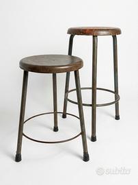 Coppia di sgabelli industriali vintage originali anni 60 in metallo. Bellissima patina, il più alto ha residui di vernice policroma molto accattivanti e vivaci. Altezze 64 e 50 cm diametri 33 e 31 cm. Prezzo per la coppia, vendibili anche singolarmente.