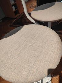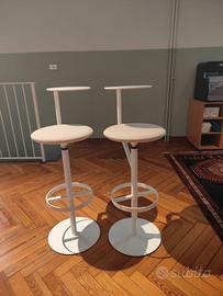 Coppia di sgabelli in alluminio bianco con seduta imbottita foderata. Tavolino di appoggio girevole