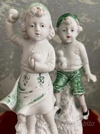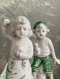 Bellissima coppia di statuette in ceramica prodotte in Germania all'inizio del 1900. Bambini che giocano a palle di neve.