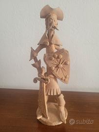 Vendo coppia di statuette in terracotta realizzate a mano, raffiguranti due personaggi dallo stile teatrale/folcloristico: un guerriero con scudo e spada e un uomo con cappello a cilindro che suona uno strumento.