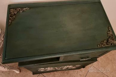 Stravagante coppia di comodini Retro’ anni 50, formata da n 2 comodini, in legno massello, colore verde con svariate sfumature.