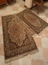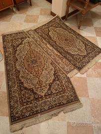 Vendo coppia di tappeti stile persiano, con classico motivo centrale e cornice decorata, nei toni caldi del beige e marrone. Completi di frange.