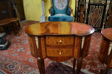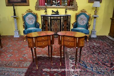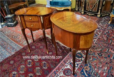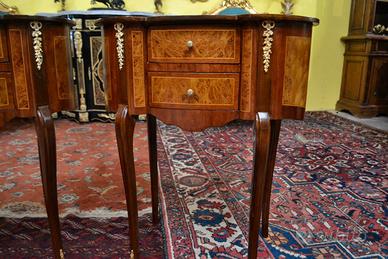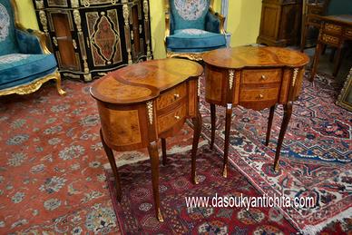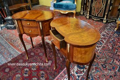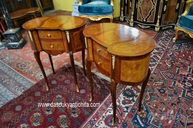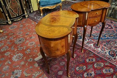 Coppia di comodini-tavolini a fagiolo in stile Luigi XV, in legno massello , lastronati in radica di noce e filettature in acero , dotati di due cassetti con maniglie a pomello, applicazioni in bronzo dorato, poggiano su gambe curve a cabriolè , rifiniti da applicazioni in bronzo dorato.