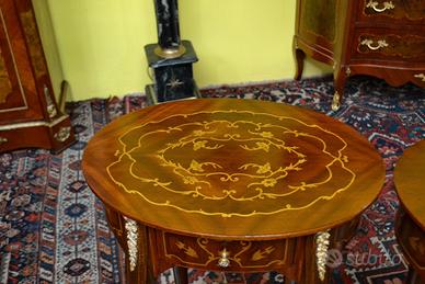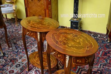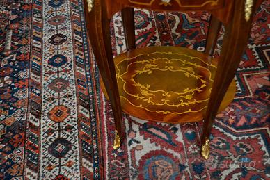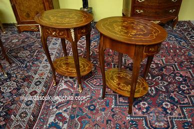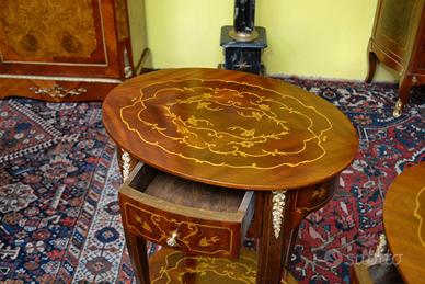 Coppia di tavolini ovali stile Luigi XV , noce e radica di noce intarsiati in legni di frutto bois de rose , acero a motivi floreali, con cassetto e pianetto, rifinito da applicazioni in bronzi cesellati e dorati.