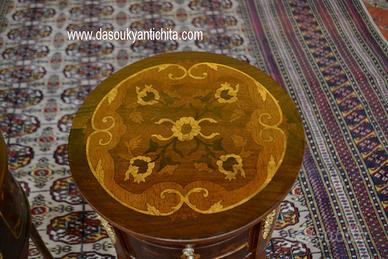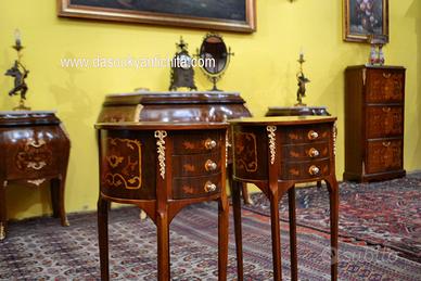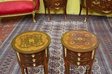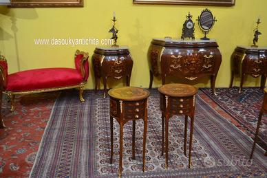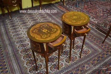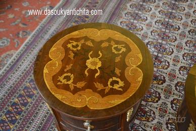 Coppia di tavolini-comodini tondi stile Luigi XV , dotati di tre cassetti , impiallacciati in noce , bois de rose , acero e legni da frutto a motivi floreali e geometrici, gambe sottili e leggermente affusolate, che conferiscono un senso di leggerezza ed eleganza. Applicazioni in bronzo dorato sui montanti laterali e sulle gambe anteriori Piccoli , versatili , aggiungono un tocco di eleganza senza occupare troppo spazio. Dimensioni : Diametro 33.5 cm. Altezza 70 cm. Chi fosse interessato a una visita virtuale della nostra galleria può accedere ai motori di ricerca, inserendo il nominativo " Dasouky antichita' " Per informazioni contattateci ai seguenti numeri Cell. Cell. EURO 260,00 SPEDIZIONE GRATUITA IN TUTTA ITALIA CON CORRIERE ESPRESSO
