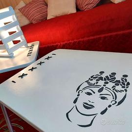 Coppia di tavolini con piano in legno e struttura in metallo. Realizzati artigianalmente e raffiguranti le teste di Moro siciliane. Dettagli "cuciti" a corda sul laterale. Possono essere posizionati anche accanto a un divano come tavolini da drink o come comodini accanto al letto.