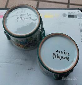 Coppia di tazze in ceramica artistica di Albisola, decorate a mano con vivaci fiori. Alte circa 10 cm. Ceramica di alta qualità con decorazione floreale dipinta a mano. Manici verdi a forma di foglia. Firmate sul fondo. Ottimo stato. Mai usate.