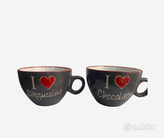 Coppia di tazze in ceramica colore grigio, capienza 450 ml, ideali per tè, tisane, cappuccino o colazioni abbondanti.