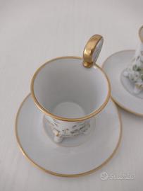 Elegante coppia di tazzine da caffè in porcellana, decorate con un motivo floreale e rifiniture dorate.