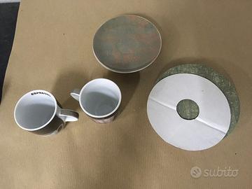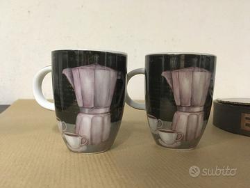 Contenuto: 2 tazzine decoro con tazzine e caffettiera; 2 piattini decoro verde e marrone.