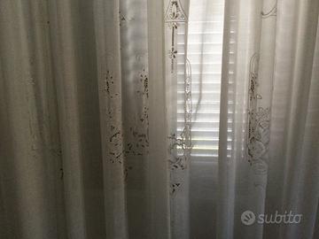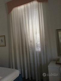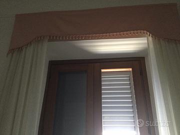 Due tende lunghe per due finestre entrambi con apertura dei teli.Mantovane in rasatello rosa.