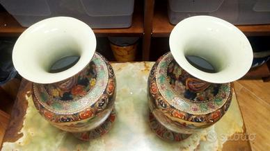 coppia di pregevoli vasi di arte giapponese in porcellana con decorazione samurai a rilievo , ottime condizioni tranne una piccola sbeccatura su di uno dei due , misurano cm 24x48 , eventuale spedizione con imballaggio adeguato