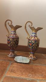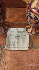Raffinata coppia di importanti vasi ad anfora in maiolica policroma e a lustro Gualdo Tadino, Manifattura Alberto Rubboli, marca: “Rubboli G.T.” Cenni Storici Il pesarese Paolo Rubboli (1838-1890) attorno al 1870 fonda a Gualdo Tadino una manifattura per la produzione di ceramiche decorate a lustro nella tradizione rinascimentale di Mastro Giorgio. Alla sua morte gli succedono la moglie e i due figli Lorenzo ed Alberto, che grazie alla raffinatissima esecuzione tecnica ed artistica, continueranno il grande successo della fabbrica esportando in tutto il mondo. La manifattura é ancora attivaIdeale come complemento d'arredo per ambienti moderni che classici.