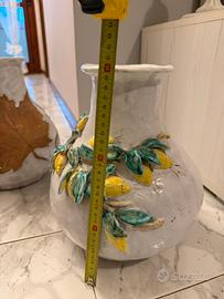 Vendo splendida coppia di vasi in ceramica artistica decorati a mano con motivi in rilievo (foglie e limoni).