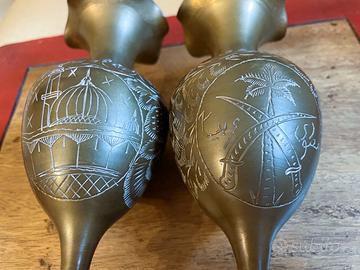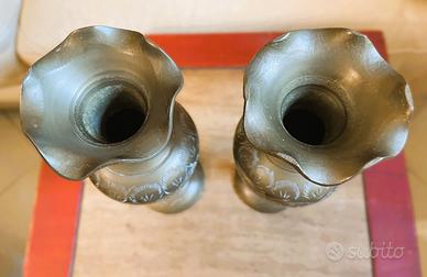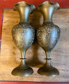 coppia di vasi in ottone con base a piedistallo, decorati con incisioni e con la bocca a forma di petalo. Dimensione Altezza 24x5,5