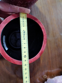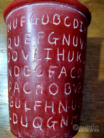 Bellissima e originale coppia di vasi in ceramica decorati e intagliate, con motivo di lettere dell'alfabeto. Color rosso scuro bordeaux e interno nero. Misure visibili nelle varie foto che fanno parte integrante della descrizione. In ottimo stato.
