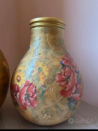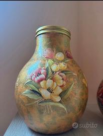 Bellissima coppia di vasi vintage dipinti interamente a mano, con splendide decorazioni floreali dai colori caldi e raffinati.