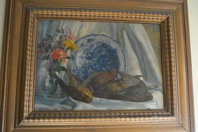 Coppia dipinti ad olio su cartone raffiguranti il primo una natura morta di porcini con piatto e cardi, il secondo una natura morta di cacciagione con piatto e vaso di fiori.