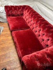 Coppia di divani chesterfield in velluto rosso di Rubelli, con piedi a cipolla e ruote, dimensioni 220x100, in ottime condizioni. Vendo anche tessuto di riserva. Il prezzo è di €1500 a divano