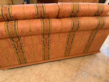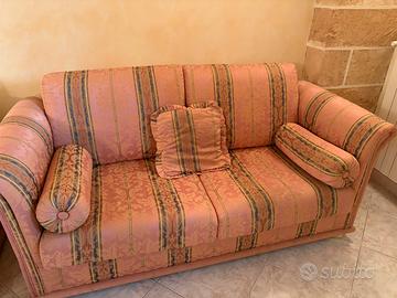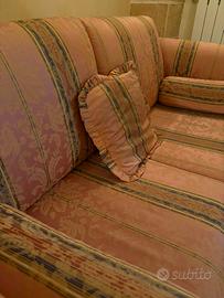 Vendo elegante coppia di divani in stile classico. Rivestimento in tessuto resistente con fantasia a righe sui toni del rosa/salmone, arricchita da dettagli raffinati. Struttura solida e imbottitura ancora comoda. I divani sono ben tenuti, senza strappi evidenti, ideali per salotto, casa vacanze o taverna. Inclusi anche i cuscini decorativi come da foto.