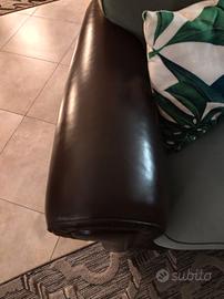 marca ditre Italia cuscini in piuma nuovi rivestimento pelle bacchetta, senza nessun segno di usura in pelle marrone scuro e tessuto verde salvia . All'interno presentano qualche escoriazione del rivestimento .
