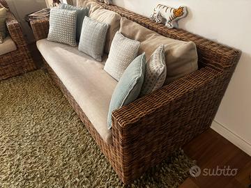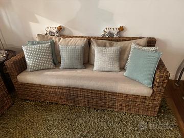 In vendita coppia di divani identici Gervasoni, modello InOut 622, firmati dalla designer Paola Navone. I divani sono caratterizzati dall'iconica struttura in rattan kubu naturale intrecciato a mano, un materiale che combina resistenza e un’estetica calda e naturale, ideale per ambienti ricercati. • Modello: Gervasoni InOut 622. • Materiale: Rattan kubu naturale intrecciato con piedini in alluminio. • Dimensioni: Larghezza 190 cm | Profondità 90 cm | Altezza 80 cm. • Condizioni: Ottime; l'intreccio è integro e la struttura solida. • Cuscineria inclusa: Materassino di seduta originale e tessuti MARIAFFLORA perfomance peretti sfoderabile • Note: I cuscini decorativi colorati e a fantasia visibili in foto sono esclusi dalla vendita. Prezzo: • Singolo divano: € 1.500 • Coppia: € 2.800 (prezzo preferenziale per l'acquisto di entrambi i pezzi).