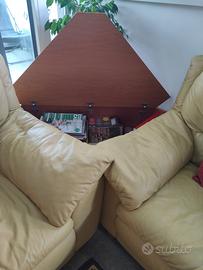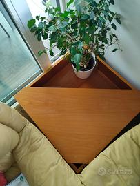 Inoltre, separatamente, è disponibile un tavolino contenitore angolare in noce chiaro, in buono stato, mis. 0,80 x 0,80 x 0,44H dotato di vano triangolare a giorno, portapiante (portabottiglie o altro) e vano triangolare chiuso apribile come portabottiglie (o altro). Detto tavolo angolare contenitore è inoltre dotato di ruote piroettanti per un facile spostamento. €. 110.