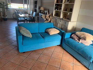 Coppia di divani blue elettrico, quello grande misura 2.30 e il piccolo 1,60. Copridivano rosa antico. Condizioni ottime
