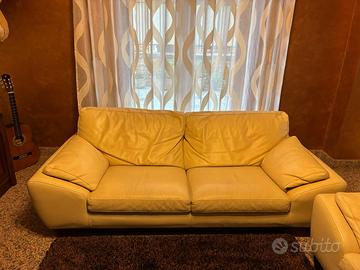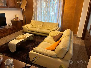 Vendo 2 divani misure cm 213 x100 e 193x100 in pelle colore avorio base legno color noce buone condizioni rivestimento e struttura, no cani/gatti no fumatori + tavolo legno massello color noce misure chiuso cm 130x90 - estendibile fino a 170x90 oppure 210x90 e 4 sedie seduta in paglia color noce, il tutto in buone condizioni tenuti con cura.