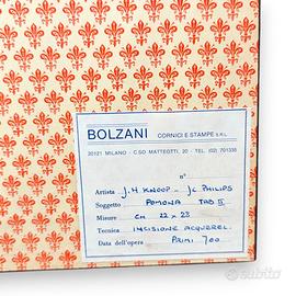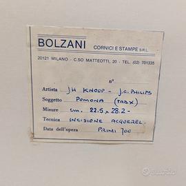 Sul retro della cornice e' presente il cartiglio della 'Bolzani cornici e stampe' di Milano e che riporta i dettagli delle incisioni.