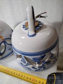 Ogni lampadario presenta decorazioni uniche, con motivi floreali e geometrici in diverse tonalità di blu, giallo e arancione.