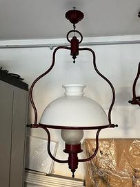 Coppia di lampadari Anni Cinquanta a forma di lanterna, in vetro smerigliato opaco e ferro battuto laccato rosso pompeiano, entrambi in ottime condizioni. Il lampadario grande misura cm 55 di diametro ed è lungo 100 cm mentre quello piccolo ha un diametro di cm 35 ed è lungo 85. Il prezzo, trattabile, si intende per entrambi i lampadari. Si vende anche il pezzo singolo a 75 euro il piccolo e a 100 euro il grande. Si trovano a Milano città (zona Navigli) con ritiro e trasporto a carico dell'acquirente: non si fanno spedizioni e non si accettano bonifici.